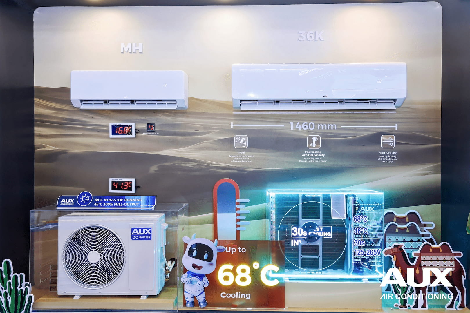 Para abordar las necesidades de los usuarios en regiones de alta temperatura y alta humedad, los aires acondicionados Serie M de AUX están equipados con "Tecnología de Enfriamiento sin Atenuación a Alta Temperatura" y un sistema eficiente de disipación de calor por refrigerante, demostrando una fuerte adaptabilidad a entornos extremos. Incluso en temperaturas exteriores extremas de hasta 68∘C, el aire acondicionado mantiene una salida de enfriamiento estable, manteniendo las temperaturas interiores dentro de un rango confortable. Una demostración en vivo que simulaba un ambiente de alta temperatura atrajo a numerosos visitantes internacionales a detenerse y experimentarla.